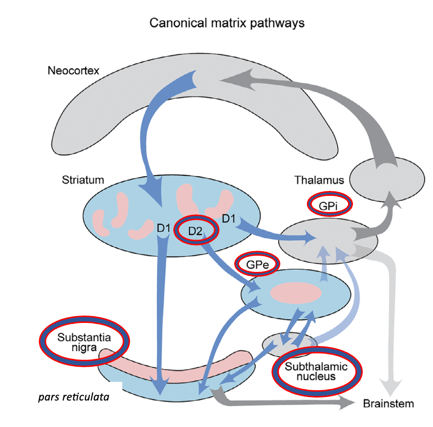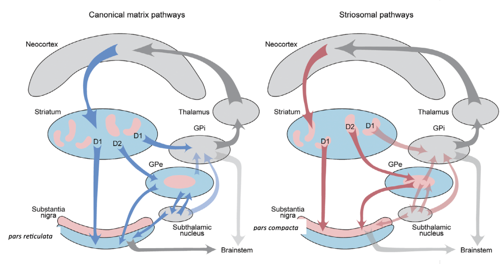 Asimimo, se describe un sistema paralelo de vías “no canónicas”, originadas en los estriosomas (un compartimento del estriado que representa cerca del 20% de su volumen), este sistema es el sistema estriosomal.