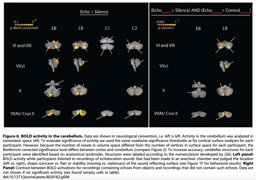 Un hallazgo particularmente revelador fue cuando los investigadores examinaron la actividad del cerebelo, una estructura que solemos asociar casi exclusivamente con la coordinación motora, pero que en realidad participa en una amplia gama de funciones sensoriales y cognitivas. En la Figura 6, tanto EB como LB muestran una activación cerebelosa marcada al escuchar los ecos de sus propios clics. Esta activación se distribuye en regiones como los lobulillos VI y VIII, el vermis, el lobulillo X y zonas del Crus II, áreas conocidas por integrar información sensorial fina y por participar en el análisis temporal de estímulos complejos. En otras palabras, el cerebelo de los ecolocalizadores no solo modula el movimiento: también parece involucrarse activamente en decodificar el “paisaje acústico” que producen sus clics, ajustando de manera milimétrica la interpretación del eco y contribuyendo a la precisión espacial que ambos demostraron en las tareas conductuales.