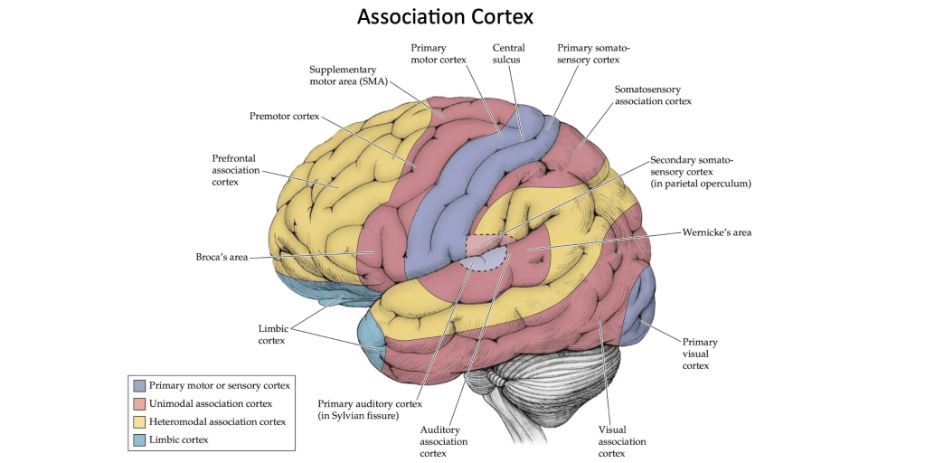 Asimismo, la corteza cerebral cuenta con una gran cantidad de áreas de asociación, encargadas del procesamiento de información compleja o de nivel superior. Dentro de estas cortezas de asociación existen dos tipos principales. Por un lado, las áreas corticales de asociación unimodal, que procesan información proveniente de una sola modalidad sensitiva o motora y se encuentran adyacentes a la correspondiente zona primaria. Por ejemplo, la corteza de asociación unimodal visual se localiza justo anterior a la corteza visual primaria. Por otro lado, las áreas corticales de asociación heteromodal integran información de múltiples modalidades sensitivas y/o motoras, permitiendo una representación más amplia y compleja del entorno y de las acciones posibles sobre él.