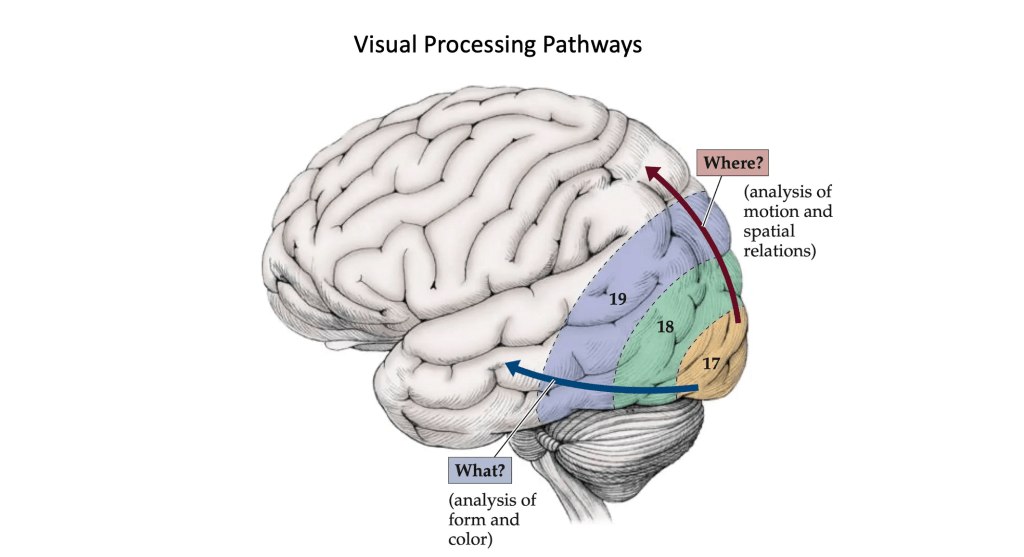Pero estas áreas de asociación son aún más interesantes, pues forman circuitos que dan significado a los estímulos sensitivos. Específicamente, para la información visual, las neuronas del área visual primaria (área 17) proyectan información hacia áreas de asociación, incluyendo las áreas 18 y 19, que interpretan movimiento y relaciones espaciales. A partir de las áreas 17 y 18 se desprenden dos grandes vías de procesamiento visual superior: