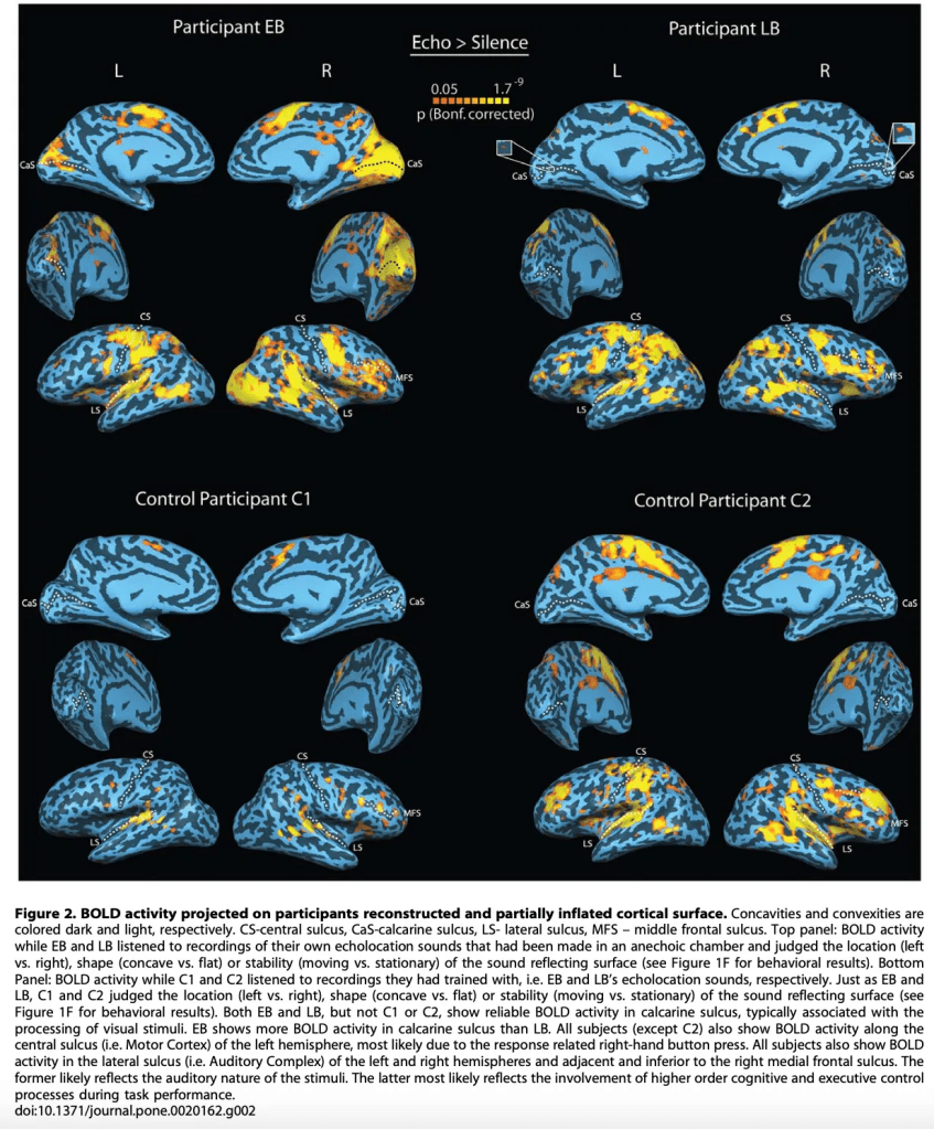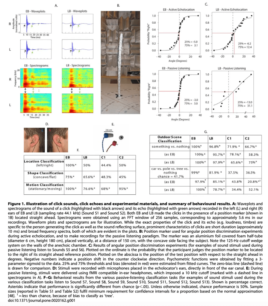 Thaler L, Arnott SR, Goodale MA. Neural correlates of natural human echolocation in early and late blind echolocation experts. PLoS One. 2011;6(5):e20162. doi:10.1371/journal.pone.0020162.