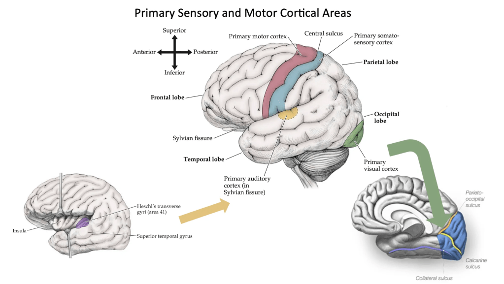 But before we dive fully into the studies on cortical remodelling in echolocation, I would like to briefly summarize the basic principles of how the cerebral cortex functions under normal conditions. It is worth recalling that the cortex contains what we call primary areas. The primary motor cortex (area 4) is located in the precentral gyrus of the frontal lobe. This area controls movement on the opposite side of the body. The primary somatosensory cortex (areas 1, 2, and 3) lies in the postcentral gyrus of the parietal lobe and participates in sensation from the opposite side of the body. Notice that the precentral and postcentral gyri are separated by the central sulcus, and that motor areas lie anterior to somatosensory areas. The primary visual cortex (area 17) is situated in the occipital lobes along the banks of a deep sulcus called the calcarine fissure. The primary auditory cortex (area 41) is composed of the transverse gyri of Heschl, two finger-like gyri located within the Sylvian fissure on the superior surface of each temporal lobe.