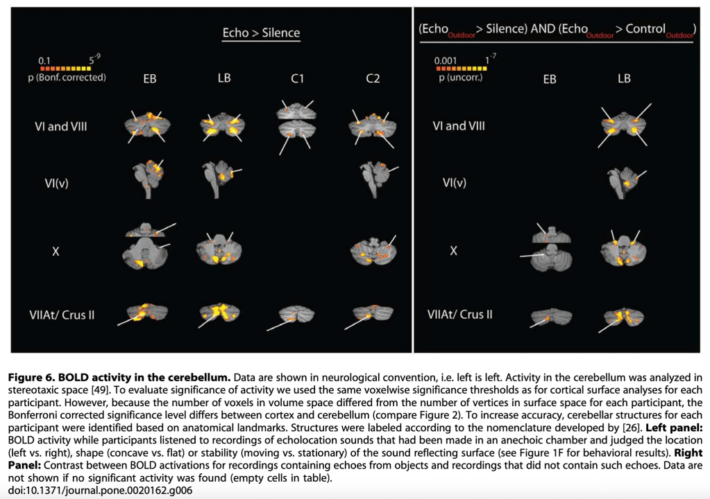 A particularly revealing finding emerged when the researchers examined cerebellar activity—a structure we often associate almost exclusively with motor coordination, but which in reality participates in a wide range of sensory and cognitive functions. In Figure 6, both EB and LB show marked cerebellar activation when listening to the echoes of their own clicks. This activation is distributed across regions such as lobules VI and VIII, the vermis, lobule X, and areas of Crus II—regions known to integrate fine sensory information and to participate in the temporal analysis of complex stimuli. In other words, the cerebellum of echolocators does more than modulate movement: it appears to be actively involved in decoding the acoustic landscape produced by their clicks, finely tuning the interpretation of the echoes and contributing to the spatial precision both demonstrated in the behavioral tasks. What is fascinating is that this cerebellar activation appears in both EB and LB, though with nuances: EB tends to show a more robust and widespread pattern, consistent with his very early blindness and long history of sensory adaptation. LB, for his part, also activates these regions, confirming that cerebellar reorganization does not depend exclusively on early-onset blindness, but also on the intensive and expert use of echolocation as a perceptual strategy. In contrast, controls C1 and C2 do show cerebellar activation, but it is far more limited and less specific. In them, the signal appears scattered and likely reflects basic auditory attention or general stimulus analysis, rather than fine echo processing or sophisticated spatial interpretation. In other words, their cerebellums hear, but they do not read the echo in the way echolocators do.