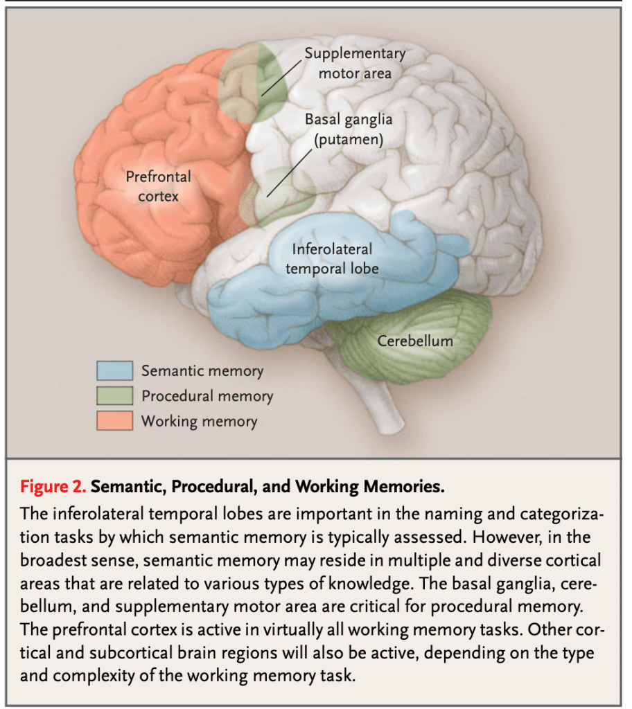 The following images—drawn from the classic article “Memory Dysfunction” by Budson and Price, published in The New England Journal of Medicine (2005)—serve to visually illustrate the principal neuroanatomical structures involved in the different memory systems.
