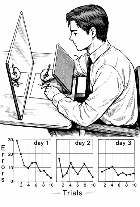 Paradoxically, his case revealed something crucial for science. Although he could not remember having learned a task, he was nonetheless able to improve at it with practice. This phenomenon was carefully documented by neuropsychologist Brenda Milner through the now-iconic mirror-tracing task. In this experiment, H.M. was asked to trace the outline of a five-pointed star with a pencil while viewing only the reflection of his hand in a mirror, forcing him to invert his usual visuomotor coordination (see illustrative image below).